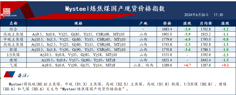 6月26日Mysteel炼焦煤国产现货价格指数