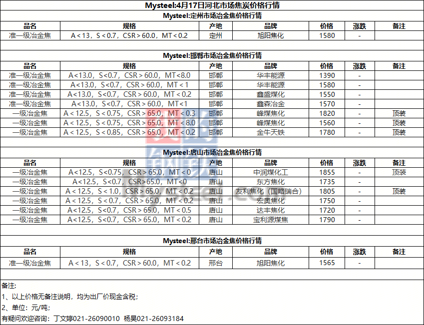 Mysteel:4月17日河北市场焦炭价格行情