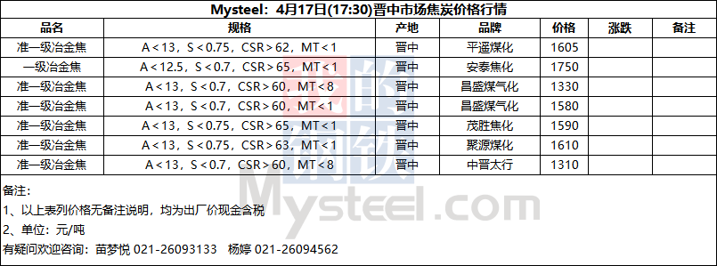 Mysteel:4月17日(17:30)晋中市场焦炭价格行情