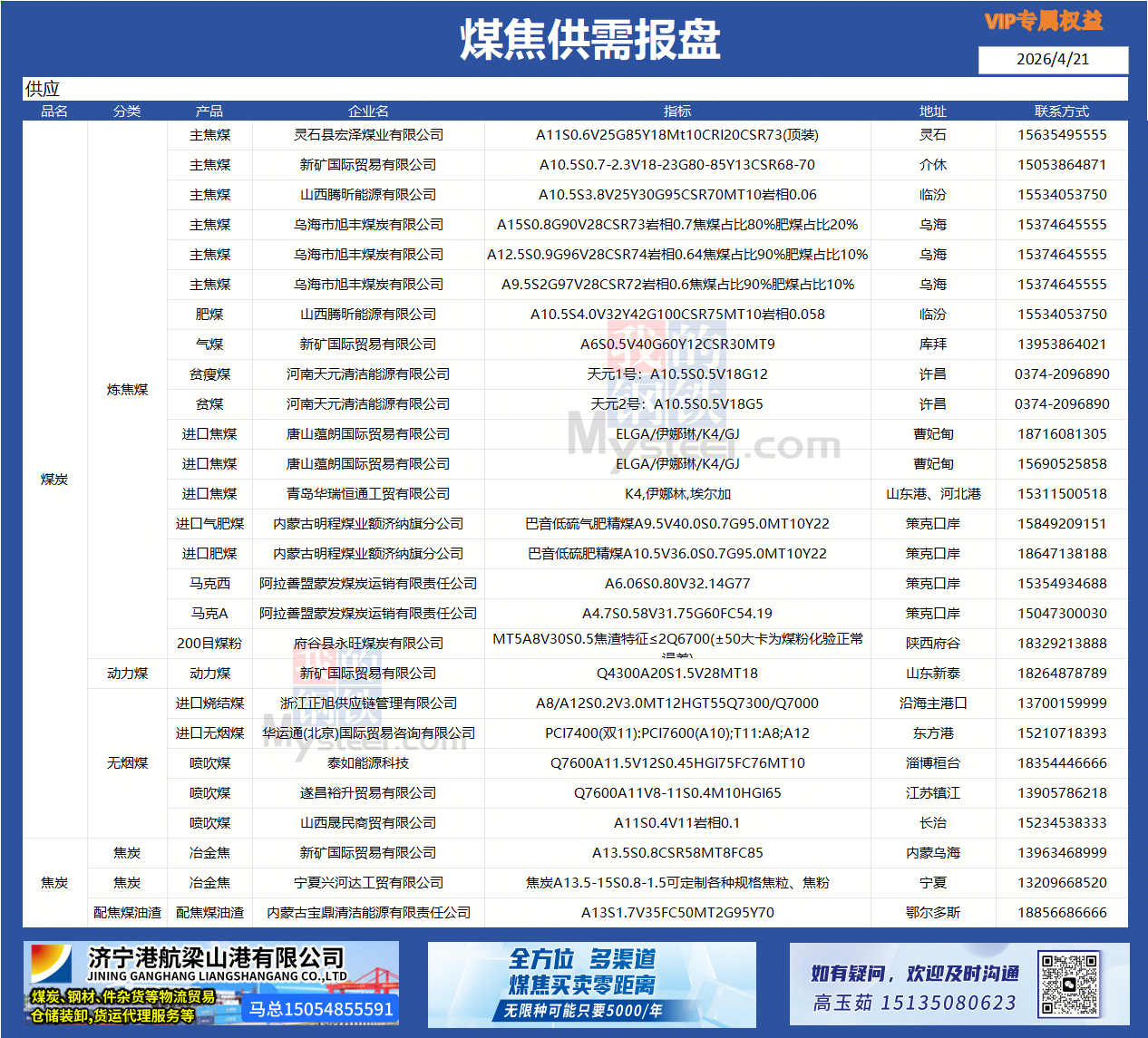 Mysteel:4月21日(10:00)煤焦供需报盘一览