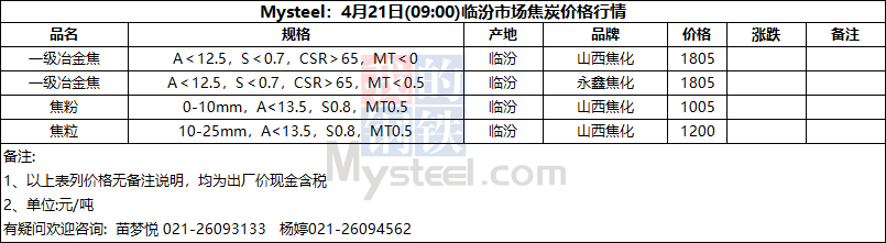 Mysteel:4月21日(09:00)临汾市场焦炭价格行情