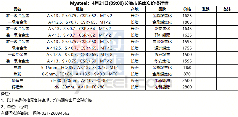 Mysteel:4月21日(09:00)长治市场焦炭价格行情